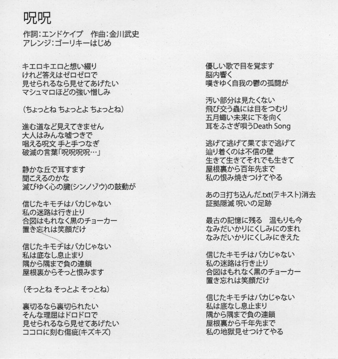 The results of that recording session would be their first release, 「呪呪」. It contains only the title track and no instrumental version. Originally to be a venue only release it was sold for the first time at the 「TOKYO IDOL SHOW CASE V3.0」on May 25th 2014.